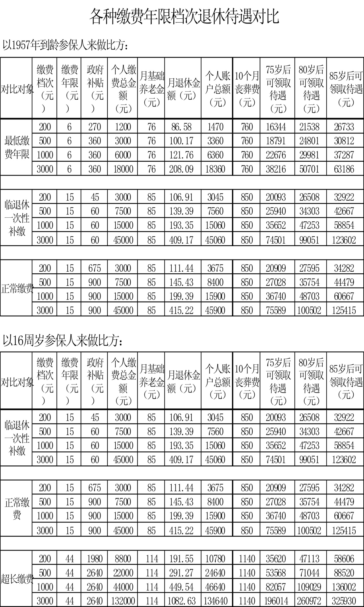 城乡居民养老保险:以缴费200元/年为例,交15年,共3000元,月交16元,退休后能拿:基础养老金85+个人账户(3000+45*15+利息)/139等于115元/月。(月交16,月领115元,个人缴费只占个零头),平均寿命75岁,180个月*115+丧葬费85*10=21550元,净赚18500元,这还不包括养老金随经济发展水平的上涨。